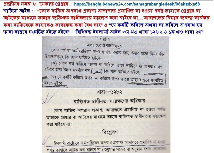 অবিশ্বাস্য হলেও সত্যি, ইসলামী রাষ্ট্রে এই ডাকাতদেরকে (কিংবা যে কোনো অপরাধীকে) এভাবে গ্রেপ্তার করা অবৈধ। খুন জখম বা ব্যাংক ডাকাতি, প্লেন হাইজ্যাক বা ধর্ষণ........যে কোন অপরাধ ঘটবার পরে আদালতে প্রমাণিত না হওয়া পর্যন্ত পুলিশ কাউকে গ্রেপ্তার করতে পারবেনা। কারণ (শারিয়া কেতাবের পৃষ্ঠার স্ক্যান নীচে দেখুন) :-
