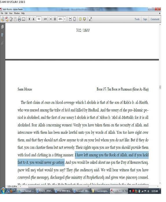 (৩) উনি রেখে গেলেন কোরান ও তাঁর সুন্নাহ “যা ধরে রাখলে আমরা কোনদিন পথভ্রষ্ট হবনা”। এটা সহি সিত্তা হাদীসগুলোর কোত্থাও নেই (সহি বুখারী, মুসলিম, আবু দাউদ, নাসায়ী, তিরমিজি ও ইবনে মাজাহ)।