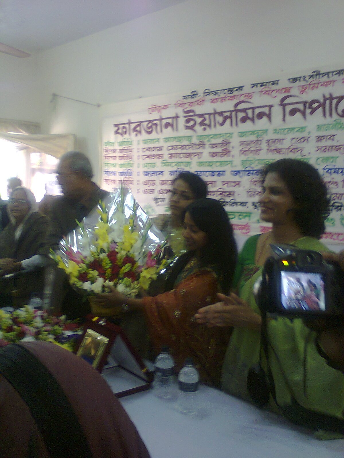 মিলনায়তনে উপচে পড়া বিশেষ করে নারী ও সংবাদমাধ্যম মুখরিত আনন্দঘন পরিবেশে সভাপতিত্ব করেন "মায়ের আঁচল"-এর নির্বাহী-প্রধান রাশিদা করিম। বক্তব্য রাখেন প্রধান অতিথি খুলনার মেয়র তালুকদার আব্দুল খালেক, স্থানীয় গন্যমান্য শিক্ষাবিদ, আইনজীবি, মানবাধিকার ও নারী-অধিকার কর্মীরা। নিপা নিজেও তাঁর বক্তব্যে যৌতুকের বিরুদ্ধে দৃঢ় অঙ্গীকার ব্যক্ত করেন ও সমর্থনের জন্য সবাইকে ধন্যবাদ জানান। তাঁর বাবা প্রবল অশ্রুকাতরতার জন্য তেমন কিছু বলতে পারেন নি। এরপর যৌতুকের বর্বরতার ওপরে স্বরচিত ও স্বসুরারোপিত একটি মর্মান্তিক গান পরিবেশন করেন খুলনা বেতারের সুগায়ক জনাব করিম। সবশেষে নিপা ও তার বাবা-মাকে ওয়ার্ল্ড মুসলিম কংগ্রেস ও "মায়ের আঁচল"-এর পক্ষ থেকে ফুলের তোড়া ও পদক উপহার দেয়া হয় ।